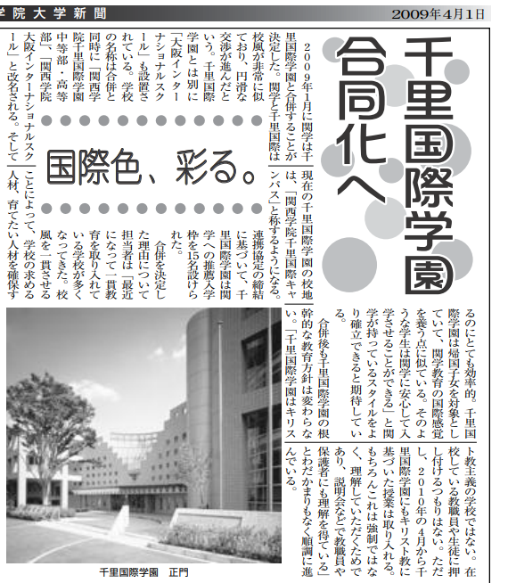 学校法人関西学院が存続し学校法人千里国際学園が解散することを前提する「合併契約」を締結、同年7月文部科学省に合併認可申請を行い、12月認可された。