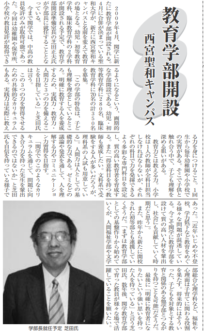 「西宮聖和キャンパス」の誕生、「教育学部」の誕生、「聖和大学聖和短期大学」が「学校法人関西学院聖和短期大学」に変更、「聖和大学附属聖和幼稚園」が「学校法人関西学院聖和幼稚園」に園名を変更。