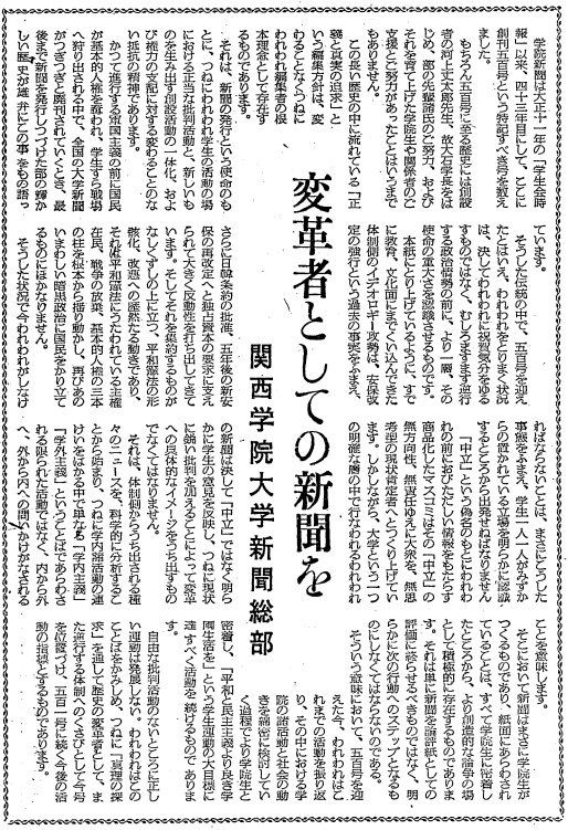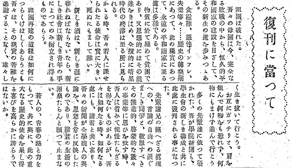 多くの先輩たちによって築かれたわが学院新聞も、学友会の新しい組織とともに、ここに復刊されることになった。 先輩たちが真理と言論の自由のために続けてきた涙ぐましい闘争や、敬服すべき啓蒙的な活動に思いを馳せるとき、私たちは自らを省みて身が引き締まる思い(恥じ入る思い)がする。しかし私たちは、いかなる時、いかなる場所でも諸君(学生諸兄)と共にあり、この新聞が全学院人の世論と思想を常に反映するものでありたい。そして、諸君の生活の源泉となることを願ってやまない。