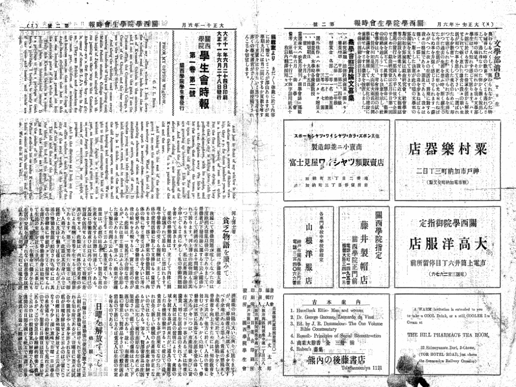原田の森キャンパス(現王子公園)時代に学生会委員によりタブロイド版『関西学院学生會時報』が創刊、その『時報』は関西学院で最初の学生の純粋な言論機関となる。