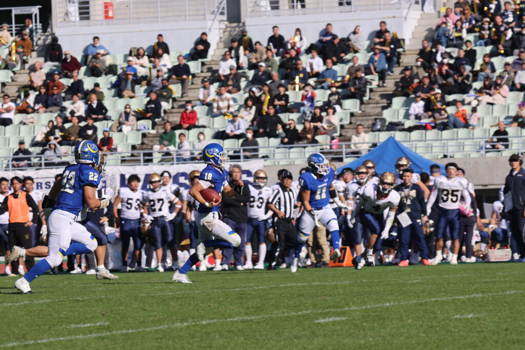 さらにQB星野太吾(社会学部2年)が自ら右サイドを抜ける53ヤードの独走TDを決め、17―0と一気に流れをつかんだ。