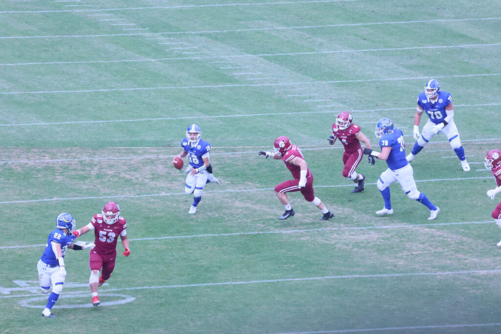 第2Qはラインバック(RB)の井上誉之選手(社会学部4年)のTDから反撃に転じる。クォーターバック(QB)の星野太吾選手(社会学部2年)も続いてTDランを決め、前半終了時点で14対21。流れを引き寄せたかに見えた。