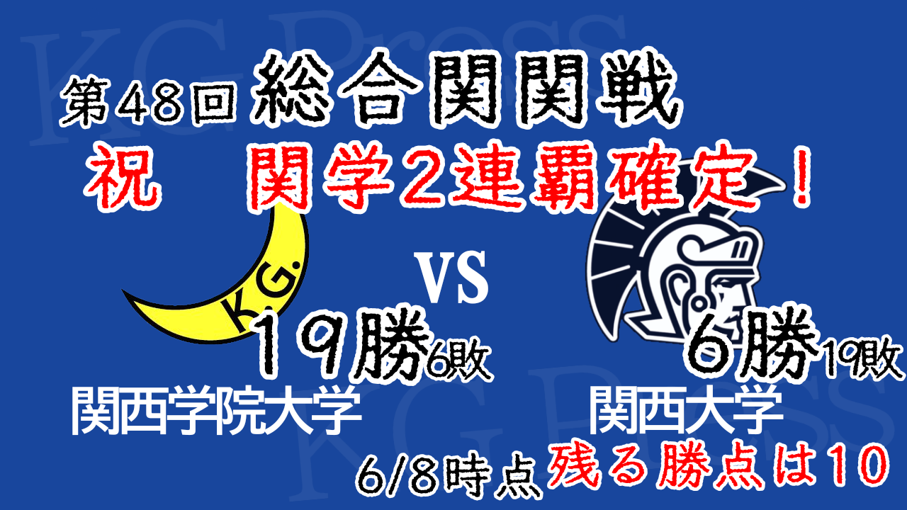 関学大は第48回総合関関戦で6月8日の結果、勝点ありで開催する部活の過半数で勝利した為、前年に続く2連覇を固めた。
