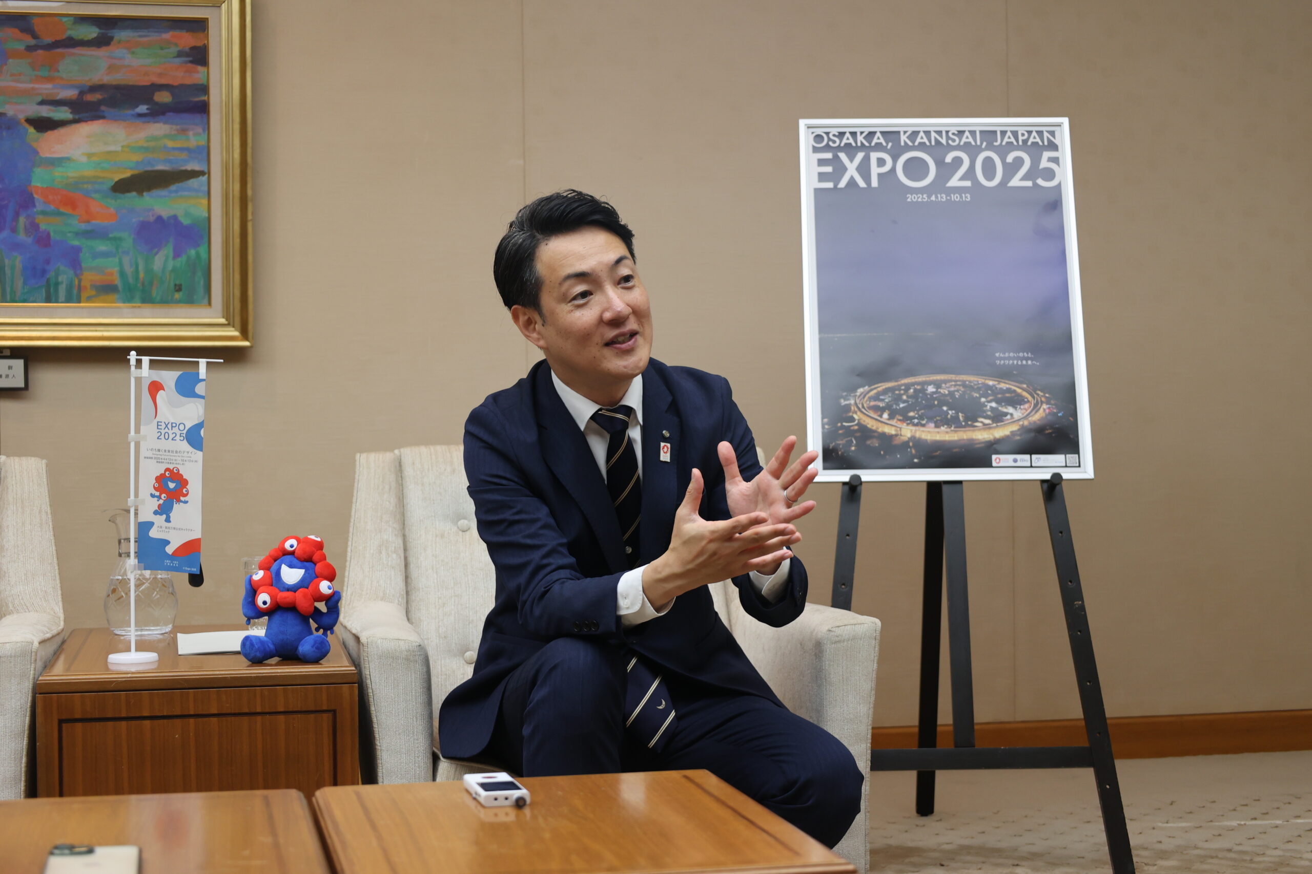 弊部は6月4日、大阪市役所本庁舎で関学大OBの横山英幸・大阪市長(経済学部卒)に現在開催されている大阪・関西万博の話題を中心にお話を伺った。