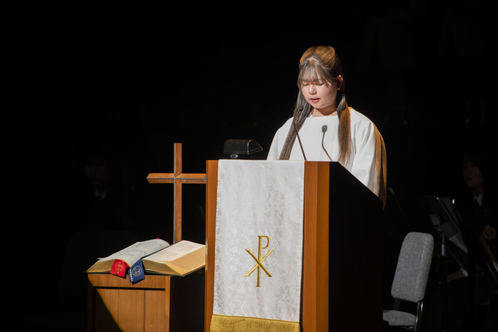 第1部で聖書朗読を務めた小林結さん(文学部2年)=宗教センター提供