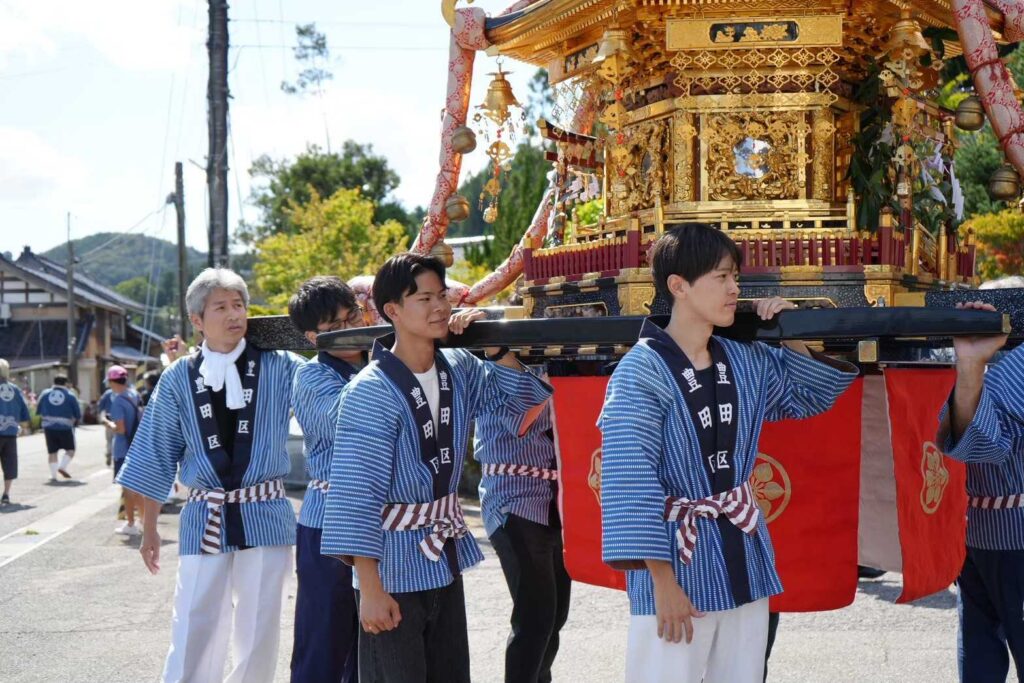 学生たちは現地で開かれた秋祭り「六保祭」に参加した。六保祭は一年の五穀豊穣に感謝する伝統行事で、地域7地区の住民が枠旗やみこしを担いで日吉神社を巡る。学生も住民とともにみこしを担ぎ、太鼓を叩くなどして祭りを盛り上げた。みこしを初めて担いだ学生は、その重さに驚きながらも楽しんでいた。