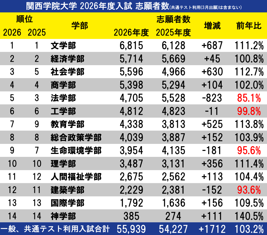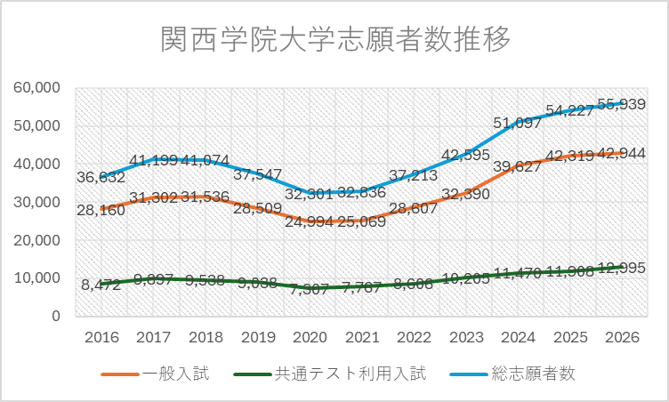 関西学院大学は、2026年度一般選抜入学試験(1月出願)の志願者状況を発表した。総志願者数は55,939人に達し、前年度(54,227人)を1,712人上回った。昨年度、50年ぶりに過去最高記録を塗り替えた関学大だが、今年度はそれをさらに更新した。2年連続で「開学以来、史上最多」の志願者数を記録する歴史的な入試となった。