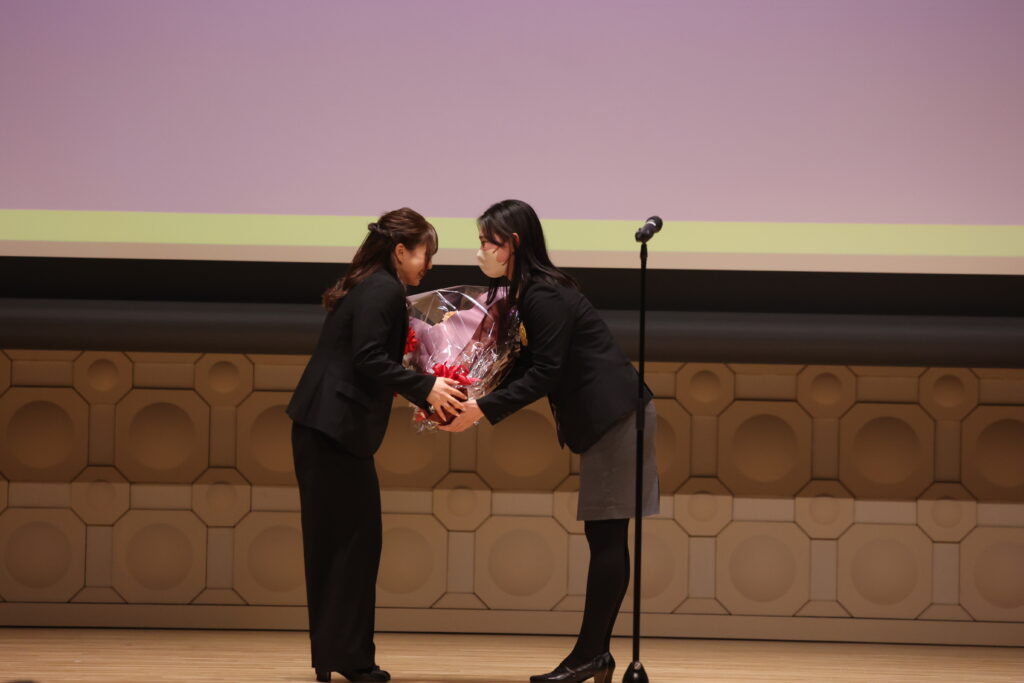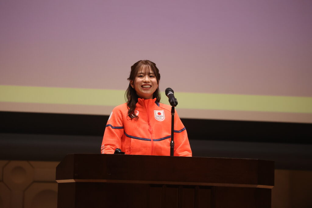 謝辞に立った長森さんは、同じくスケート部OBで平昌五輪に出場した横山大希さん(2016年経済学部卒)に触れ、「8年前、平昌五輪に出場された際の壮行会に参加し、その瞬間、私の夢は目標へと変わりました」と語った。