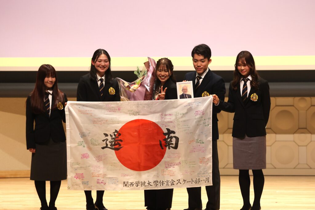 会では、応援団総部からの激励に加え、スケート部部員からの「遥南」と名前が入った寄せ書き入りの国旗と、花束が贈られた。