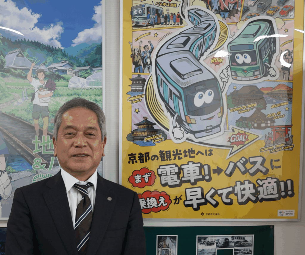 北村信幸局長と地下鉄の利用を呼びかけるポスター=2026年2月6日、京都市交通局本庁舎、仲悠士撮影