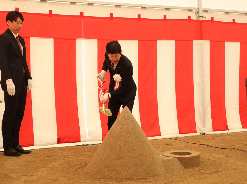起工式の最後には、森学長ら5人がくわ入れを行った。「えい」という掛け声とともに盛砂を崩し、工事の安全を祈った。