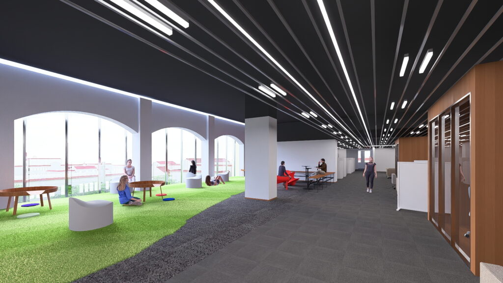 施設内には複合的な機能を備える。1階にはラウンジやイベントスペース、回廊にテラス席を配置するほか、現在G号館にある「セブン―イレブン」や「スターバックスコーヒー」の移転を予定している。